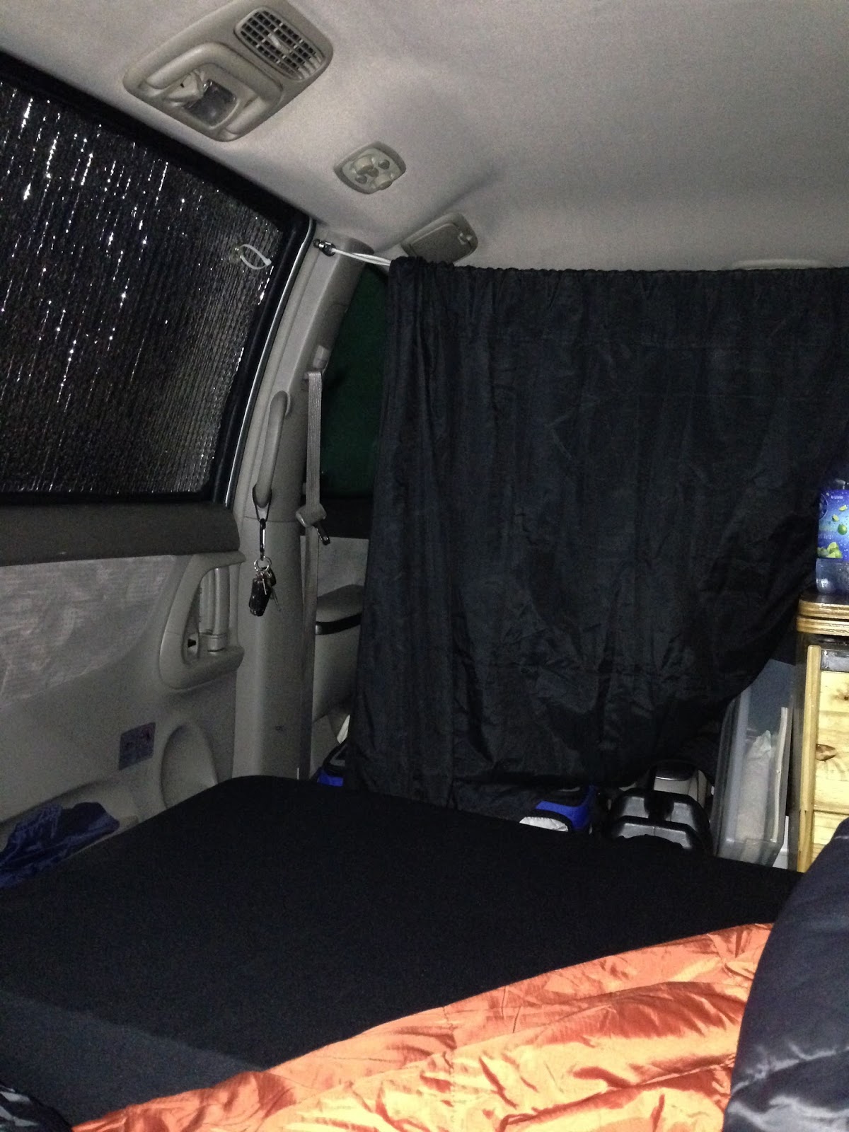 Bought a 2007 Toyota Sienna! My grid beam plan didn't fly due to the curvy interior of the van. So Far I have built a folding bed to couch using an Ikea pine single bed frame. I removed all the rear seats attached the headboard upside down to extend the bed posts into the trunk by the rear hatch cut two feet off the end of the bed added two foot drawer slides, so the bed slides back into it's self and the 3/4 inch plywood top folds into a couch. having a hard time figuring the back brace for the seat back. Basically I ripped off the Grove Guy's awesome design but I made the bed wider as we are both over 6 feet! We sewed velcro to the firm foam cushions and glued and stapled it to the plywood bed platform so it won't slide off during car chases. The widest possible bed limits the Westfailian shelves on the driver side of the van to spice rack size but we plan to hang netting from the oh shit handles along that side a la Das Boot. With the bed pushed back into the "couch" position a tiny living room appears. Behind the rear seat my plan is to put a small cabinet wit a small swivel table and a large bowl sink. This narrow cabinet will also slide out the passenger side sliding door (2 foot drawer slides) and a fold out table on the door side will open out and extend the kitchen outside further like the Australians like to do.